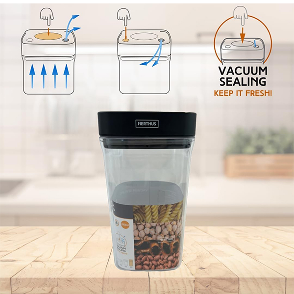 Канистерът с вакуумно затваряне е идеалното решение за по-дълго запазване на свежестта на храната Ви. Бурканът е идеален за съхранение на малки порции храна като подправки, ядки, билки и други, като ги поддържа винаги свежи и защитени от въздух и влага, благодарение на херметичното си вакуумно уплътнение. Дизайнът с квадратно дъно не само му придава модерен вид, но и Ви позволява да оптимизирате пространството в килера или хладилника си, което го прави лесен за съхранение заедно с други контейнери. Изработен от издръжлив материал без BPA, този контейнер е безопасен за храни и е проектиран да издържа на ежедневна употреба, без да губи своята вакуумираща способност. Освен това е лесен за почистване и е подходящ за съдомиялна машина, което осигурява бързо и лесно почистване след всяка употреба. Този херметически затворен канистер е идеален за запазване на храната Ви свежа и вкусна.