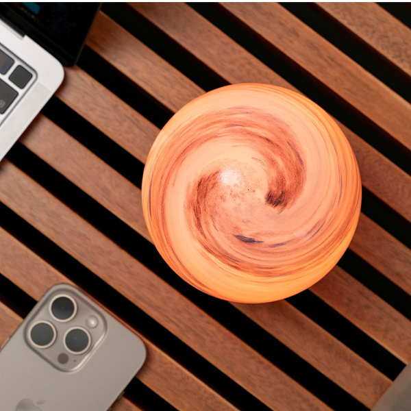 В тиха вечер след дълъг работен ден си представете, че се свивате в леглото с любимата си книга и топла напитка. Мекото сияние на лампа AstraGlass Light изпълва стаята, нейното ръчно рисувано стъклено кълбо хвърля очарователни сенки, които Ви напомнят за спокойна, звездна нощ. Независимо дали предпочитате живата и непрекъснато променяща се игра на 7 въртящи се RGB светлини или спокойния блясък на бяла светлина, тази лампа се адаптира към настроението Ви с просто докосване на медния тъч бутон. Задръжте бутона по-дълго и светлината леко намалява или става по-ярка, предлагайки перфектната атмосфера за всеки момент. С AstraGlass Light можете да създадете всякаква атмосфера, която да отговаря на Вашето настроение и да създадете перфектната вечер за Вашата нощ на релакс. Лампата AstraGlass Light се вписва безпроблемно във всяка обстановка, от уютен кът за четене до просторна всекидневна. Нейните четири отличителни покрития – Galaxy Breeze, Sandstorm, Polar Cloud и Stellar Ocean – добавят нотка космическо чудо към Вашия домашен декор. Тази лампа е идеална за всеки, който е очарован от прекрасния природен феномен на нашия свят. Екологичната основа на лампата, изработена от FSC-сертифицирано дърво от американски орех, допълва нейния небесен дизайн. Ще се впише идеално в тъмния ъгъл на библиотека или дори на нощното шкафче. Ръчно издуханият стъклен глобус показва занаятчийска изработка, като гарантира, че всяка лампа е уникална като самите звезди. USB-C порта за зареждане осигурява удобство. Сега можете да превърнете Вашето любимо място в убежище, където елегантността среща природата. С лампата AstraGlass Light всяка вечер се превръща в среща със звездите, осветявайки тихите, вълшебни моменти на живота и внасяйки нов смисъл в думите комфорт и релакс.