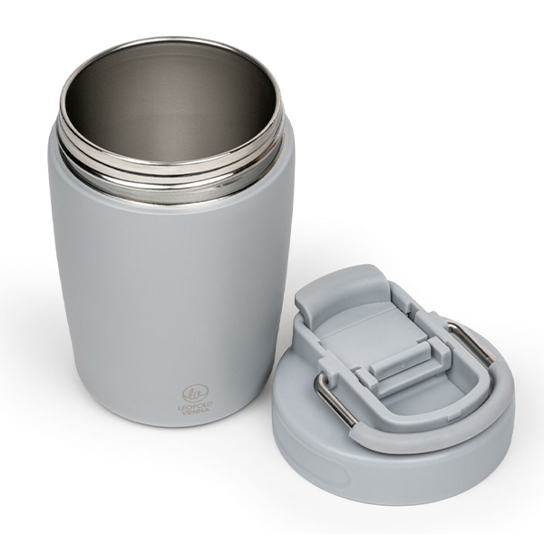Термочашата се отваря и затваря лесно, а допълнителната дръжка я прави лесна за носене. Капацитетът е 350 мл. Предлага се в ментово и сиво.