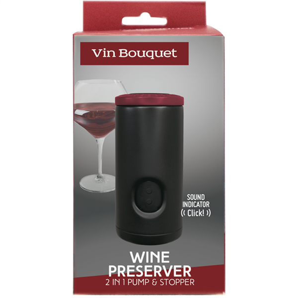 Тапа за вино с вакуум помпа и звуков индикатор. Позволява Ви да запазите виното по-дълго време след отваряне на бутилката. С патентована звукова индикация. Забавете процеса на окисление и запазете свойствата на виното за по-дълго с тапата с вакуум помпа на Vin Bouquet. След като бутилката e отворена, поставете тапата и изпомпвайте въздуха от бутилката, докато чуете специфичен звук, който показва, че вакуумът е създаден успешно.