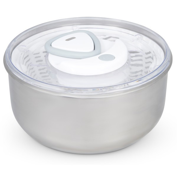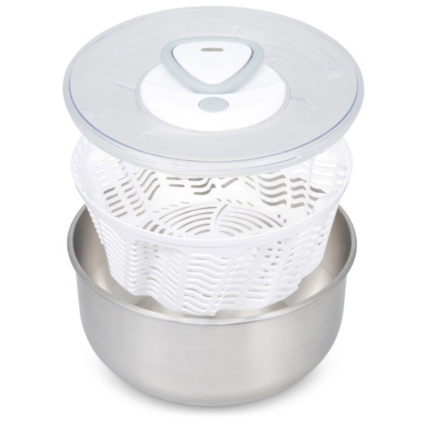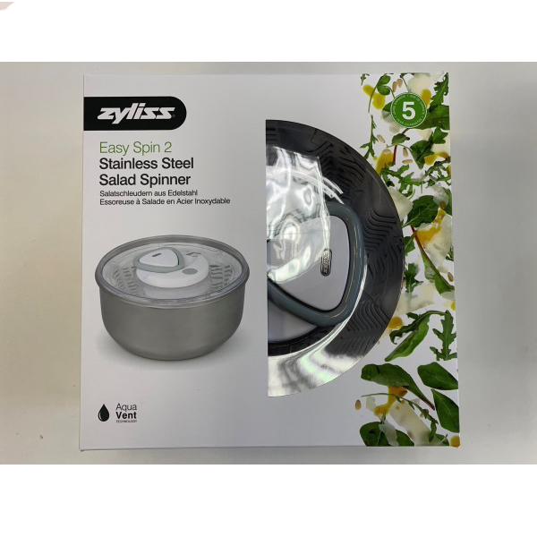 Zyliss произвежда първата си центрофуга за салата през 1978 г. Оригиналната Easy spin е бестселър от години и скоро е актуализиран с нова, ергономична дръжка. Центрофуга за салата Zyliss Easy Spin е всичко, от което се нуждаете, за да измиете и отцедите пресни зеленчуци. Просто издърпайте дръжката, за да започнете да отцеждате измитата салата, и натиснете копчето за спиране на центрофугата. Патентованата кошница Aqua Vent има уникален дизайн, който внимателно завихря зеленчуците около купата при въртене, за да увеличи максимално циркулацията на въздуха и увеличава максимално отвеждането на водата. Готовата салата можете да сервирате направо в купата на центрофугата, а кошницата можете да използвате като гевгир. Easy Spin се почиства изключително лесно. Капакът се разглобява за цялостно почистване. Купата и кошницата са подходящи за съдомиялна машина (Забележка: Капакът не е подходящ за съдомиялна машина).