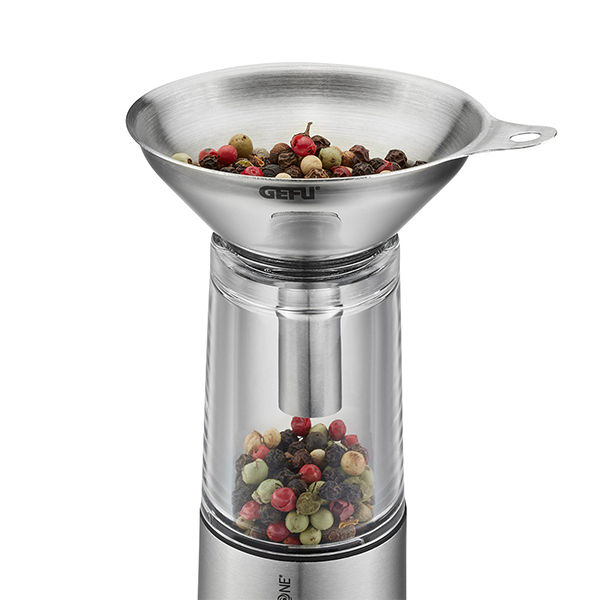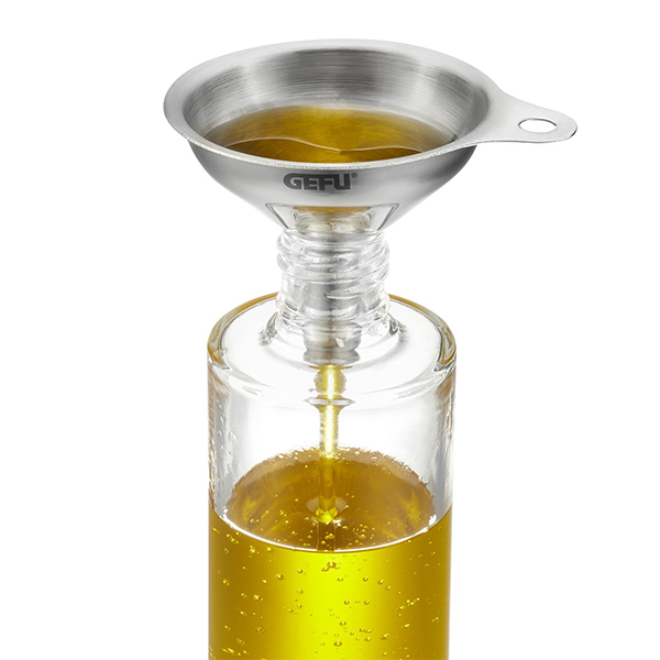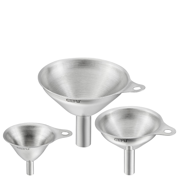 Ако има нещо, което не може да липсва в кухнята, това е фуния. А с комплекта от 3 фунии от неръждаема стомана VERSARE от Gefu ще имате три различни размера, така че да можете лесно да пълните бутилки, термоси, оливерници , мелнички за подправки и др. 3-те фунии в комплекта могат да бъдат поставени една в друга, като заемат минимално място, а металният ги държи заедно, когато не ги използвате. Всички фунии в комплекта са изработени от висококачествена неръждаема стомана и са подходящи за съдомиялна машина. Те не абсорбират миризми или вкусове, така че можете да ги използвате за пълнене на олио, оцет, вино, подправки, ликьори, есенции, сосове, бульони или сокове.