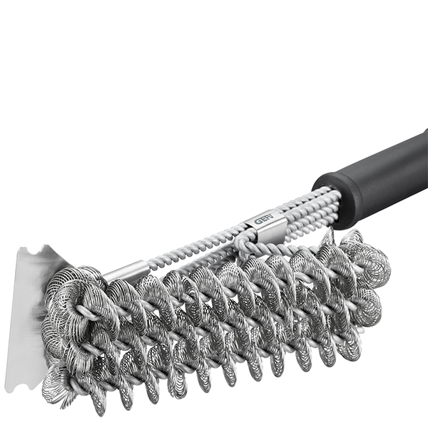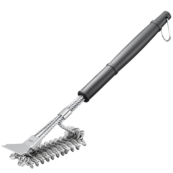 С тази високоефективна четка и без усилие ще накарате и най-мръсната скара да заблести отново. С гъсти стоманени спирали, остатъците от печене се отстраняват значително по-добре, отколкото с косъмчетата на конвенционалните четки за грил. Благодарение на специалния ъгъл между дръжката и главата на четката, почистването е ефективно и ви осигурява работа без умора. А особено упоритите загари, могат лесно да бъдат отстранени с интегрирания, здрав стоманен скрепер. Изключително дългата дръжка позволява скарата да се почиства и докато е още гореща.