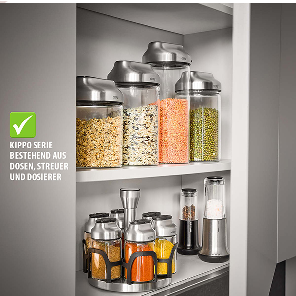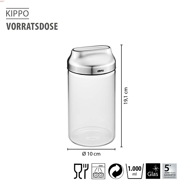 KIPPO е перфектният избор за всеки, който иска да съхранява храната си по стилен и функционален начин и се радва на добре организирани кухненски рафтове. Край на разпиляната храна или досадното развиване на капака - едно просто движение на ръката е всичко, необходимо за прецизно и чисто дозиране на захар, брашно, мюсли или паста. Благодарение на силиконовото уплътнение в интелигентния капак, съдържанието на буркана остава свежо и с плътен вкус за по-дълго време. Висококачественият буркан от боросиликатно стъкло ви позволява да следите съдържанието през цялото време.