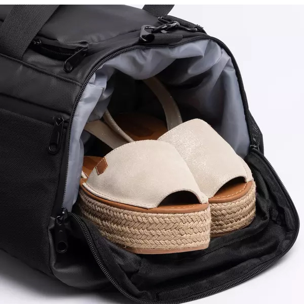 Мултифункционална пътна чанта- сак от еко кожа с премиум и водоотблъскващо покритие. Разполага с голямо основно отделение, подплатен джоб за лаптоп и няколко външни джоба за бърз достъп до дребни вещи. Специално обособеното отделение за обувки осигурява удобство и организация при пътуване. Всички ципове са водоустойчиви за максимална защита, а подплатената презрамка с функция раница осигурява комфорт и гъвкавост при носене.