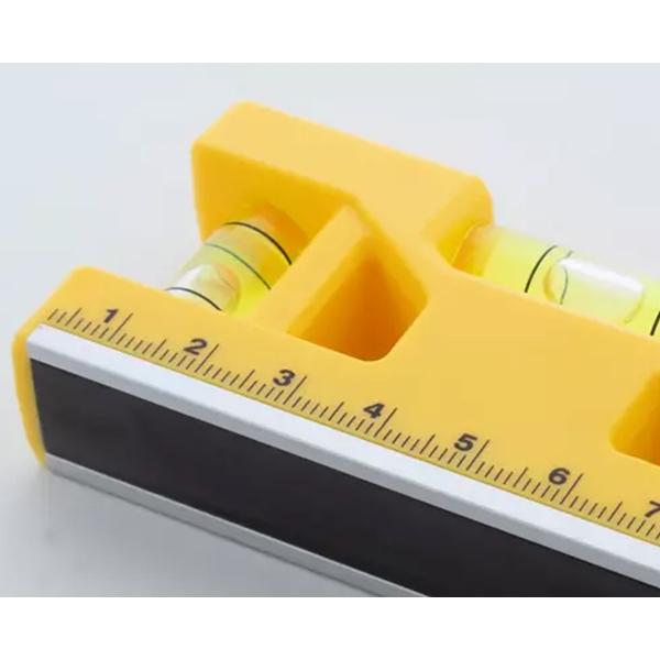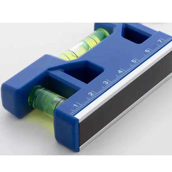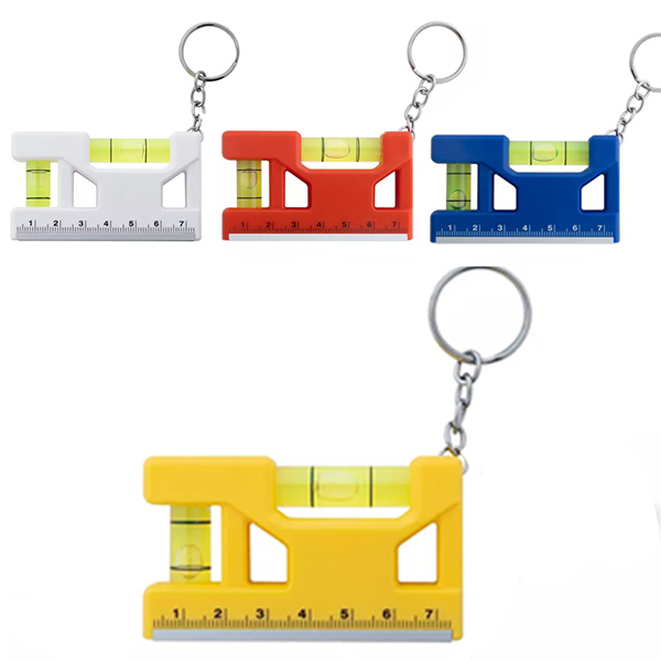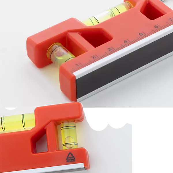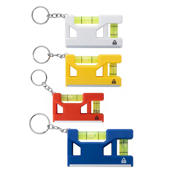 Ключодържател от рециклирана ABS пластмаса. Вградена линийка, магнит и два нивелира с мехурче.