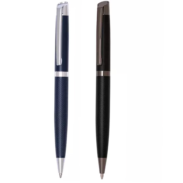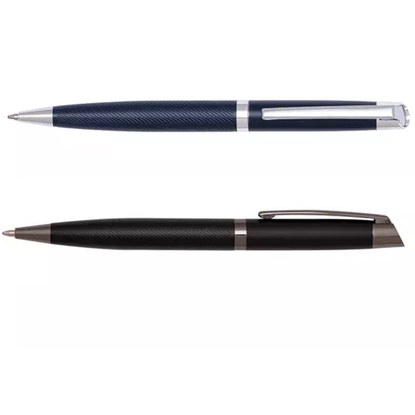 Тази елегантна черна химикалка е перфектна комбинация от модерен дизайн и практичност. Тя се отличава с гладко, матово черно тяло в горната част и фино набраздена долна част, което допринася за по-удобно захващане. Нейните металик акценти ѝ придават изискан и професионален вид.