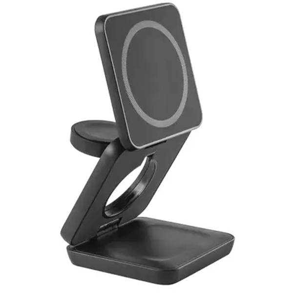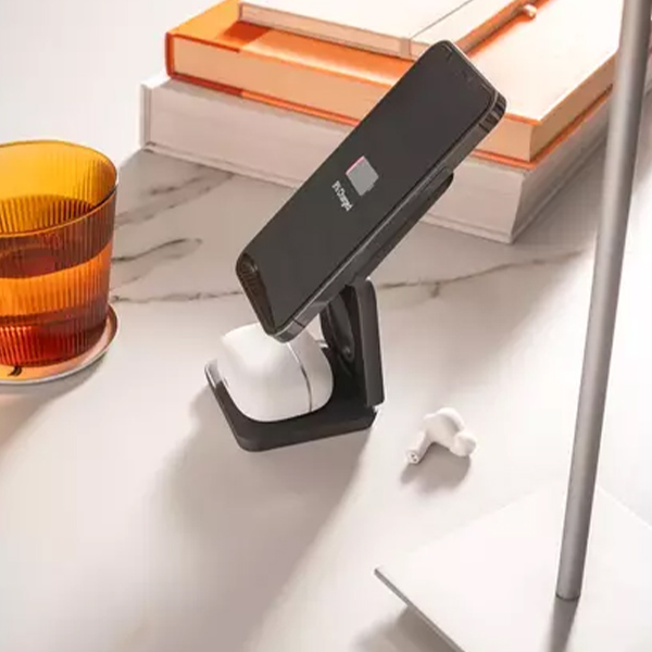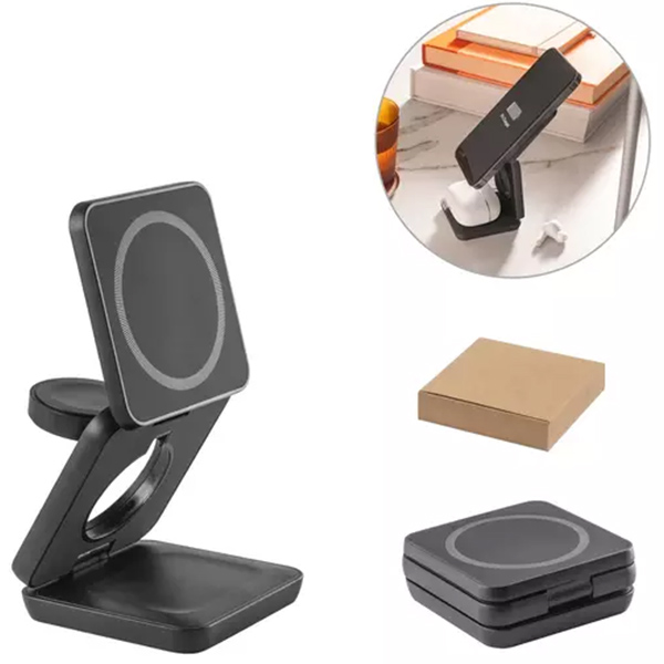 Компактно сгъваемо зарядно устройство за едновременно зареждане на до три устройства: смартфон (15W), слушалки (5W) и часовник (2,5W). Изработено от 100% рециклирана ABS пластмаса, с магнитна плоча за стабилно закрепване на телефона. Включва USB-C кабел и допълнителен магнитен пръстен за устройства без вграден магнит. Доставя се в еко-опаковка от крафт хартия.