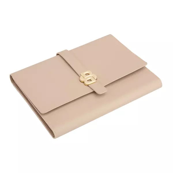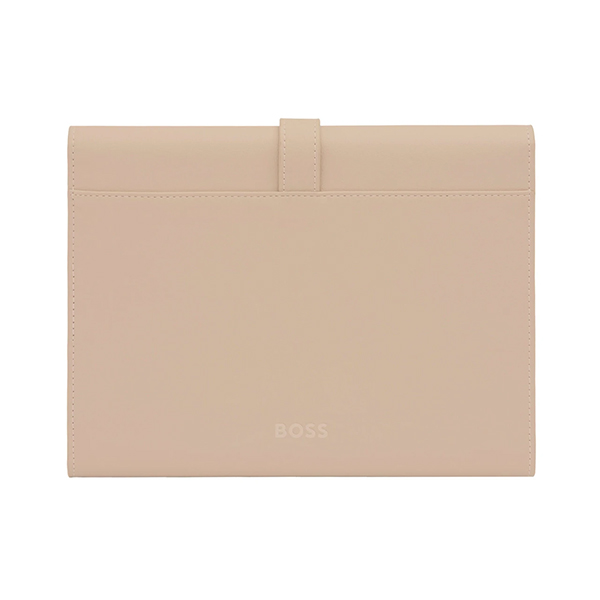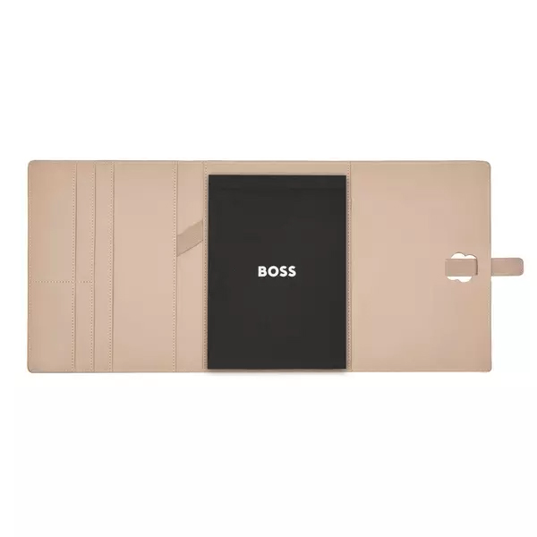 Тази папка A5 от BOSS впечатлява с елегантна цветова комбинация и изискани златни акценти. Със своята голяма, светло позлатена катарама Double B и мека текстурирана еко кожа, тя излъчва стил и престиж. Контрастът между бежово покритие и златните детайли подчертава изтънченото ѝ излъчване.