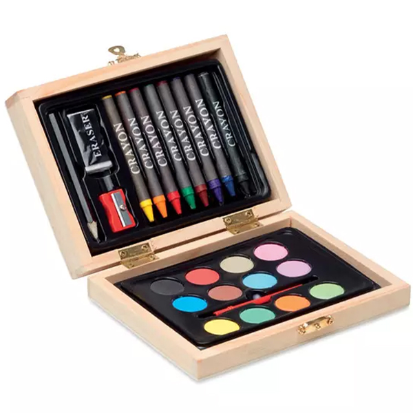Мини комплект за художник в дървена кутия, включващ 8 пастели, 12 водни боички, 1 четка за рисуване, 1 острилка, 1 гумичка и 1 молив.