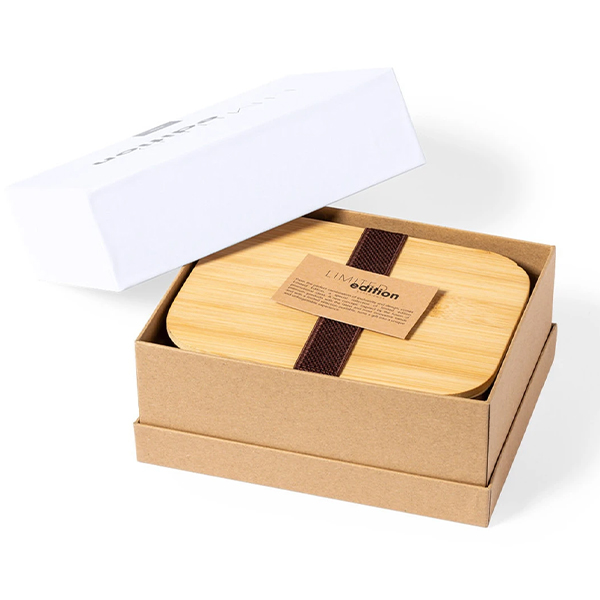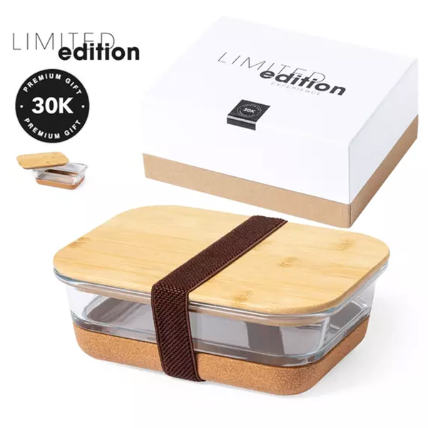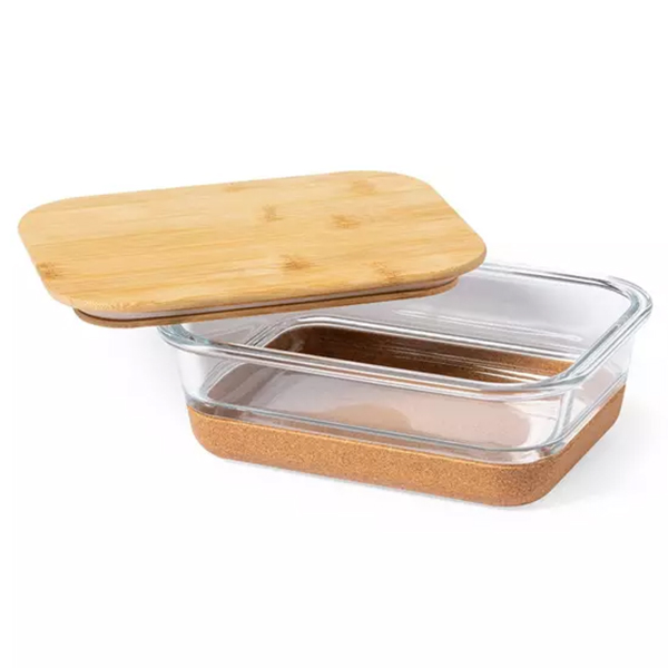 Кутия за храна с основно отделение от висококачествено стъкло с вместимост 730 ml, херметичен капак от бамбук и основа от естествен корк. Включва лента за затваряне.