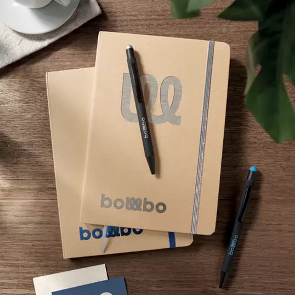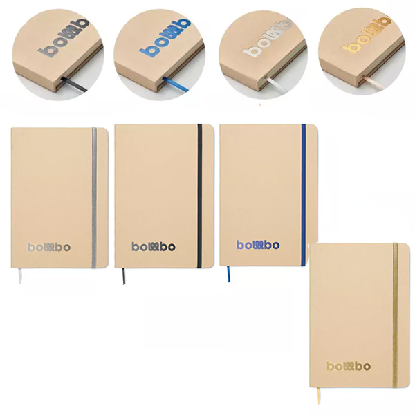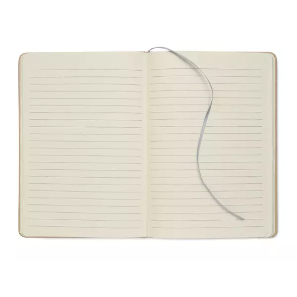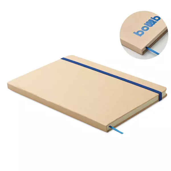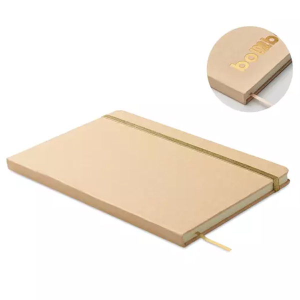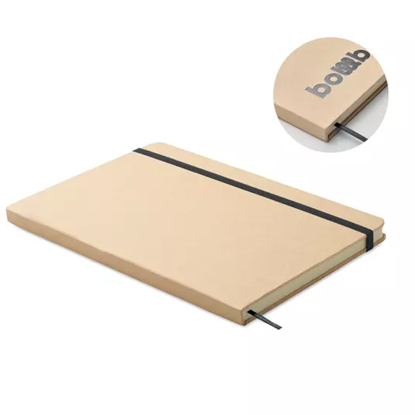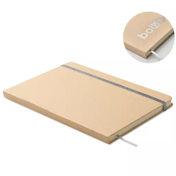 Екологичен бележник A5 с твърда корица от рециклиран картон (бежов цвят). Съдържа 160 страници (80 листа) с редове, изработени от рециклирана хартия. Разкрива цвета си при лазерно гравиране. Включва еластична лента за затваряне и маркираща лента в съответстващия цвят.