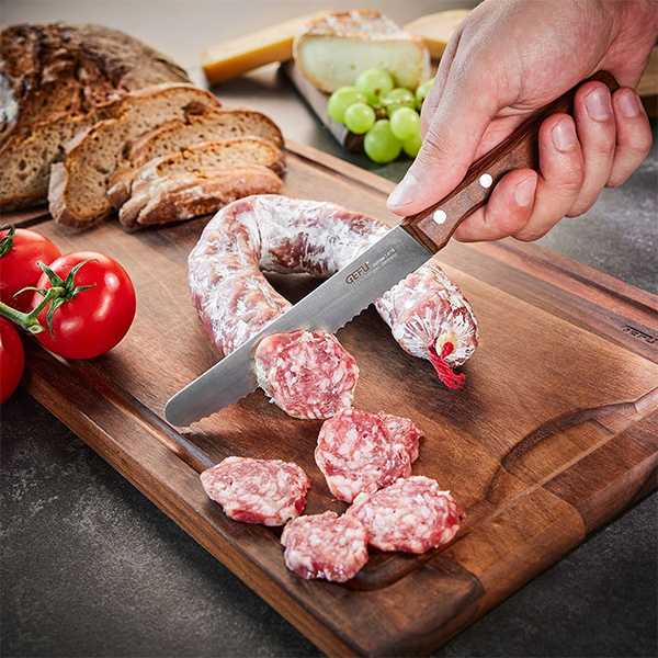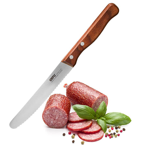 Ножът STULLE е перфектният спътник за закуска, брънч, лека закуска или вечеря. Благодарение на назъбения си ръб, ножът е универсален и е подходящ както за рязане на хрупкави хлебчета и питки, така и за рязане на колбаси, сирена или зеленчуци. Изработен в Солинген от неръждаема немска стомана, занитена към фина орехова дръжка - здрав, надежден и издръжлив нож.