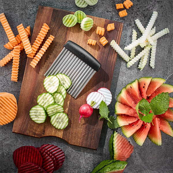 Независимо дали става въпрос за домашно приготвени пържени картофи, оребрени чипсове или декоративни зеленчукови плата – вълнообразният резец придава на ястията стилен и красив вид за нула време, благодарение на специалното си острие. Благодарение на ергономичната дръжка и прецизните разрези, всяки продукт се нарязва перфектно, без храната да се смачква