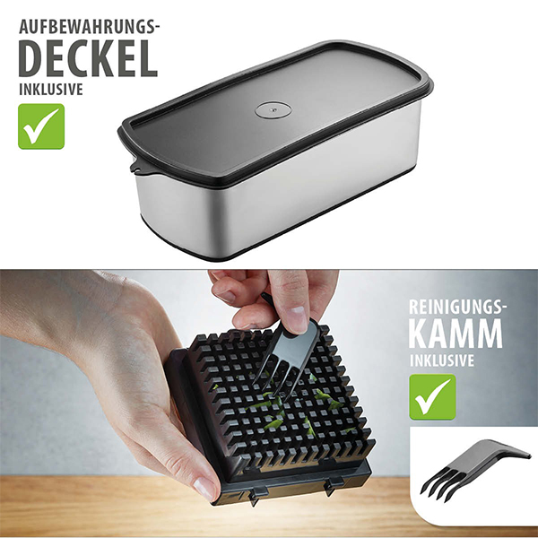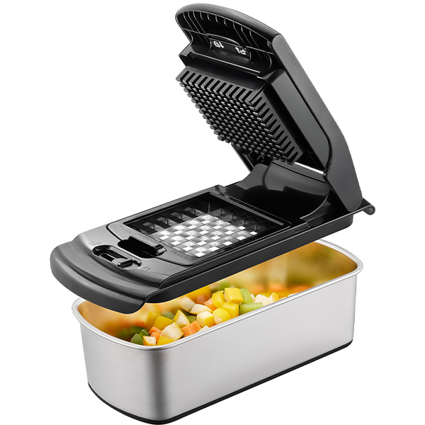 Няма по-бърз или по-удобен начин да превърнете плодовете и зеленчуците в кубчета, пръчици и перфектни резени. Изключително острите ножове осигуряват лесно рязане и постоянни резултати – от фино (за салати или гарнитури) до едро (за вкусни яхнии и ястия). Висококачественият и здрав контейнер не само предлага стилен и модерен външен вид, но и осигурява безпроблемна чистота и организация по време на рязане, приготвяне и съхранение.