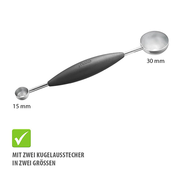 Двойно-сферичният нож е перфектният инструмент за лесно оформяне на топки от пъпеши, диня, краставици, картофи или масло. С прецизната си функция за рязане, той превръща обикновени плодови салати, гарнитури и десерти във визуални акценти, които мигновено ще събудят апетита ви.