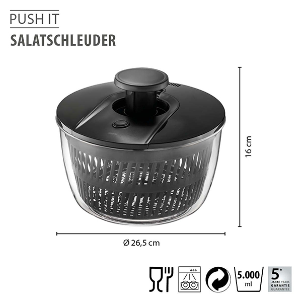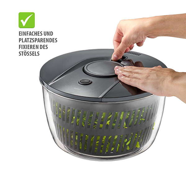 PUSH IT – така работи! Просто натиснете практичния механизъм PUSH няколко пъти, за да отстраните водата и излишната влага от пресните салати за нула време. Вграденият чучур в капака позволява излишната вода лесно да се излее от купата и хрупкавата салата да бъде готова за овкусяване. Умният бутон "Stop" позволява мощният, но нежен цикъл на центрофугиране да бъде прекратен с едно натискане на бутон.