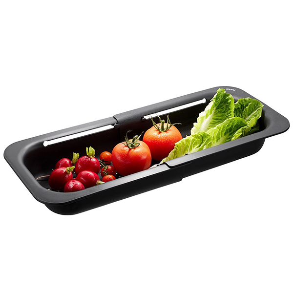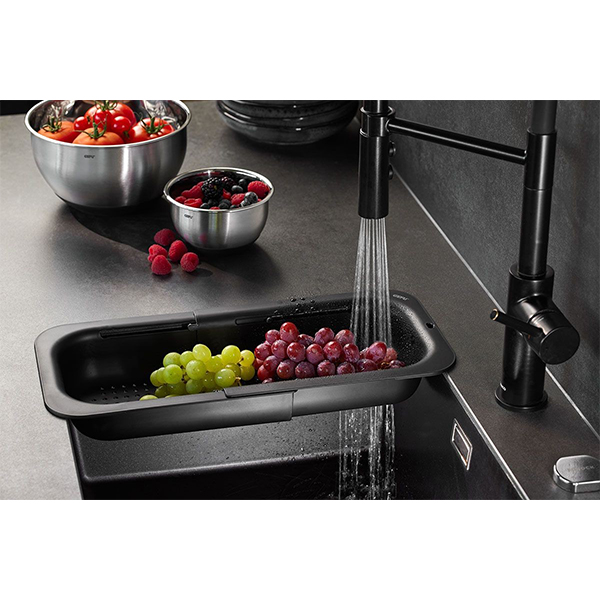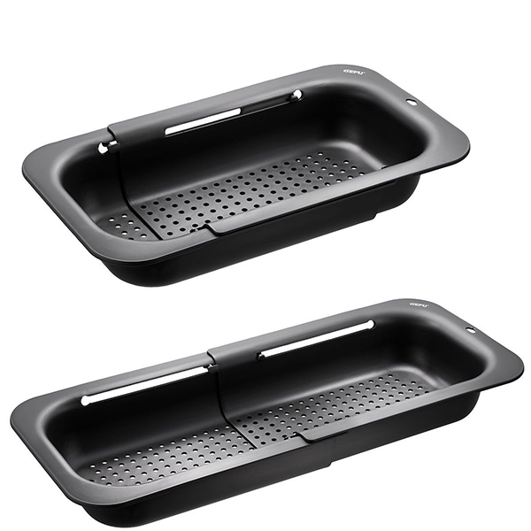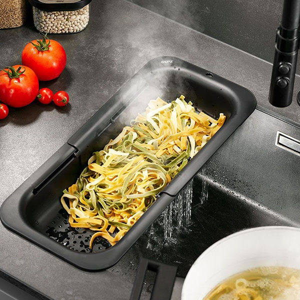 DRENARE e универсален съд за безопасно отцеждане на паста, измиване на плодове и зеленчуци, отцеждане на съдове или просто като практичен рафт за съдове за миене на съдове. DRENARE е с регулируем размер и следователно се побира в почти всяка мивка.