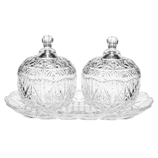 Красивите и многофункционални стъклени буркани с капаци са изработени от стъкло. Подходящи са за сладкиши, ядки, сосове и др.. Подносът може да се използва и отделно.