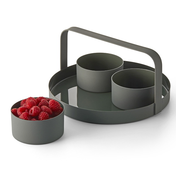Минималистичният, модерен комплект от четири части CLARA е изработен от матова прахово боядисана стомана и има безопасно за храна емайлирано покритие отвътре. Перфектен за кино вечерите у дома с пуканки, ядки и чипс. Като алтернатива, за събития с тапас, такос, гуакамоле, сосове, сирена, крекери и всичко останало, което минава под името finger food. В сладкия вариант с шоколад, гумени мечета и макарони. Е, за промяна, разбира се, можете да отидете и към по-здравословно - сурови зеленчуци, хумус, вкусни сосове или прясно нарязани плодове. Практичната дръжка за носене на таблата гарантира, че можете да сервирате лесно и удобно.