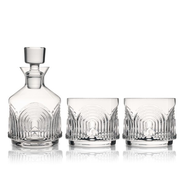 Повтарящ се мотив на дъгата, в комбинация с безоловен кристал, придават на тези текстурирани чаши артдеко стил. Подредени една в друга гарафата и двете чаши имат формата на бутилка, което изглежда много стилно и спестява място.