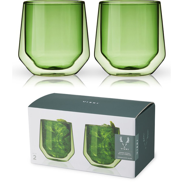 Ръчно изработен от издръжливо боросиликатно стъкло в зелен цвят, този комплект двустенни чаши поддържа температурата на Вашата напитка и внася цвят на масата. Подходящи са за коктейли, вино, айс кафе и др. Всяка чаша е с вместимост 270 мл. и може да се мие в съдомиялна машина.