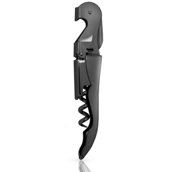 Този тирбушон за вино е с двоен лост, пет степенен свредел, отварачка за бутилки и интегриран в дръжката нож за фолио.