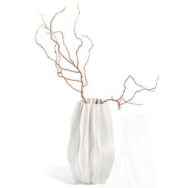 ИЗКУСТВО ОТ 3D ПРИНТЕР 3D печатът звучи толкова технически, но е още по-удивително какви спиращи дъха форми могат да бъдат създадени с него. Принтерът нанася слой след слой от керамика с дебелина приблизително 1 mm. След два часа и половина вазата е изградена от основата до отвора. След това се изпича в пещ при 1200°C, при което фината слоеста структура се запазва и създава очарователен контраст с преливащия, лек плисиран вид. Ваза PLISSEE е запечатана отвътре с глазура (до половината от височината), което я прави водоустойчива при аранжирането на живи цветя. Почистването е на ръка с мека, влажна кърпа и не трябва да се мие в съдомиялна машина.