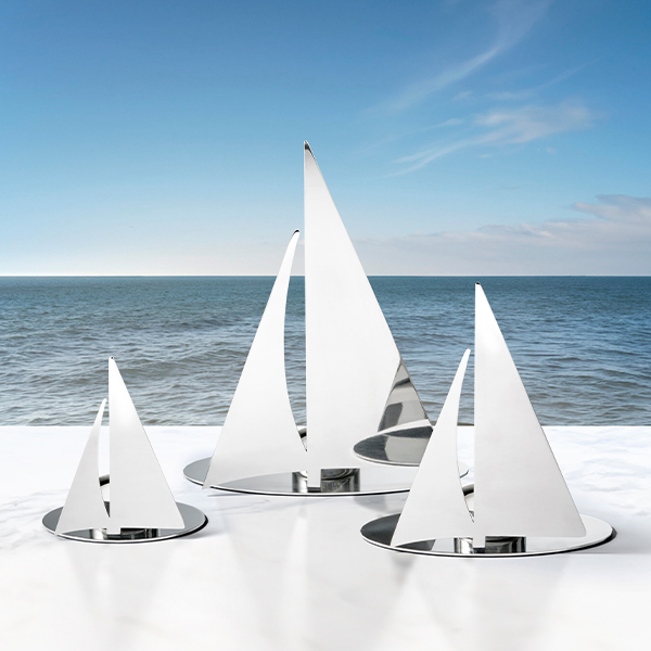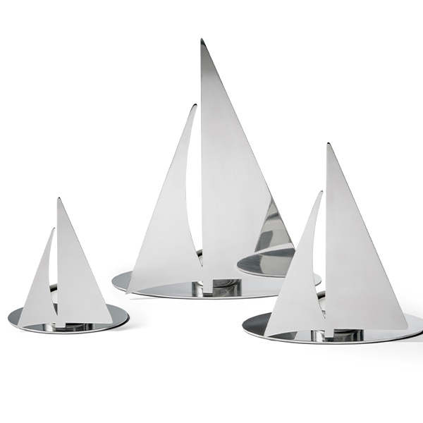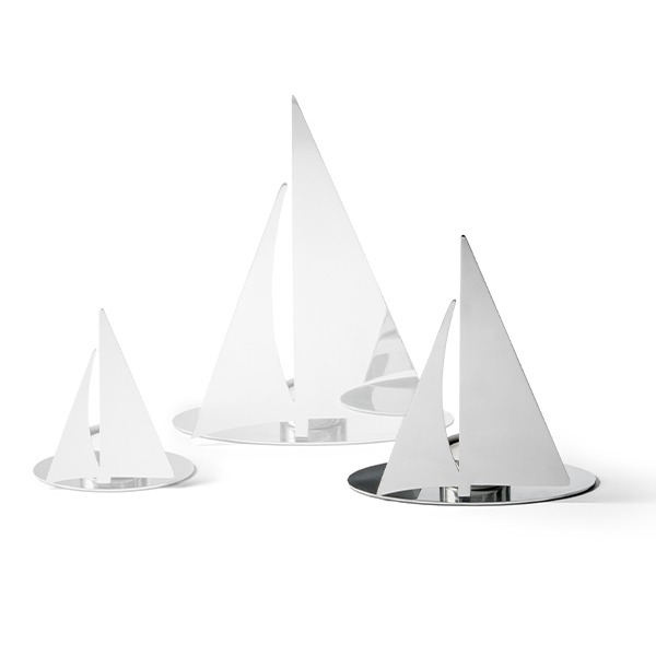 Свещник REGATTA за чаени свещи се предлага в три различни размера. Изработен от неръждаема стомана, той стои сигурно на масата или на перваза на прозореца, а теглото му надеждно го предпазва от преобръщане. Светлината на свещта се отразява върху полираната повърхност на платната и изпълва стаята с морска аура.