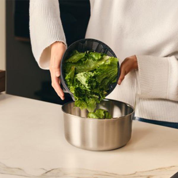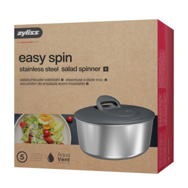 Zyliss произвежда първата си центрофуга за салата през 1978 г. Оригиналната Easy spin е бестселър от години и скоро е актуализиран с нова, ергономична дръжка. Центрофуга за салата Zyliss Easy Spin е всичко, от което се нуждаете, за да измиете и отцедите пресни зеленчуци. Просто издърпайте дръжката, за да започнете да отцеждате измитата салата, и натиснете копчето за спиране на центрофугата. Патентованата кошница Aqua Vent има уникален дизайн, който внимателно завихря зеленчуците около купата при въртене, за да увеличи максимално циркулацията на въздуха и увеличава максимално отвеждането на водата. Готовата салата можете да сервирате направо в купата на центрофугата, а кошницата можете да използвате като гевгир. Easy Spin се почиства изключително лесно. Капакът се разглобява за цялостно почистване. Купата и кошницата са подходящи за съдомиялна машина (Забележка: Капакът не е подходящ за съдомиялна машина).
