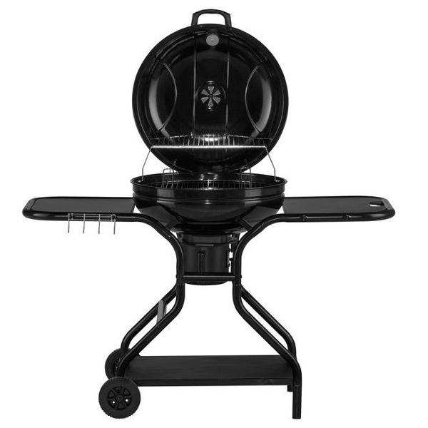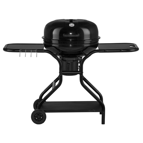 Скара на дървени въглища със странични масички. Решетката за скара с Ø 54,5 см е изработена от хромирана стомана. Капакът и долната купа са от дебела емайлирана стомана. Под решетките има подвижен съд за пепелта. Чрез клапан в капака се регулира въздушния поток. Термометърът позволява лесно да се следи температурата вътре в скарата.