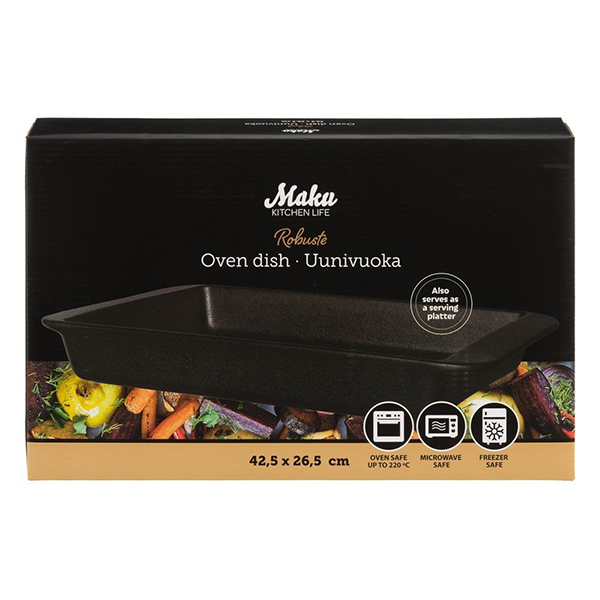 Керамична, издръжлива и стилна черна тава за печене, която служи и като поднос за сервиране. Устойчива на топлина до 220 градуса. Може да се мие в съдомиялна машина.