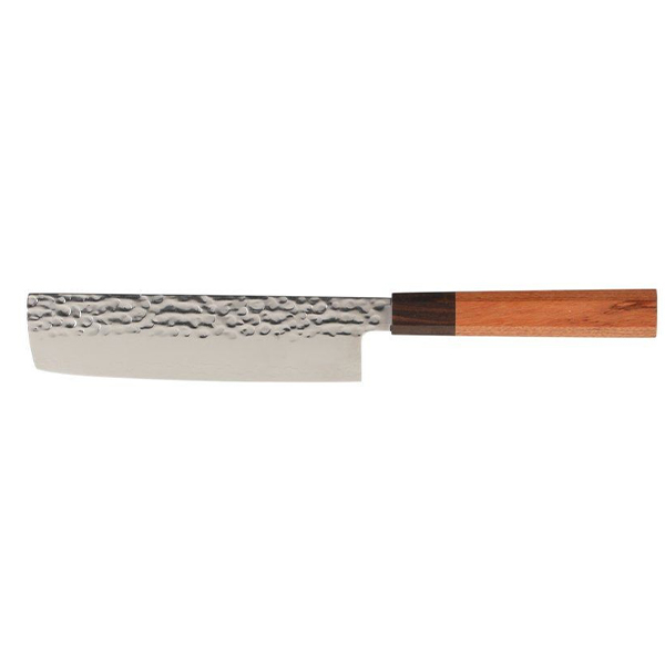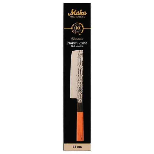 Острието на този нож е изработено по технологията на дамаската стомана, при която десетки слоеве стомана – в случая шестдесет и седем – се наслояват и коват заедно. Тази техника създава структура, в която твърдостта и здравината вървят ръка за ръка с гъвкавостта и устойчивостта на износване. С твърдост от около 58–60 HRC по скалата на Рокуел, острието запазва своята изключителна острота дори при продължителна употреба. Вълнообразният рисунък по повърхността не е декоративно нанесен, а е естествен резултат от наслагването на слоевете, което прави всяко острие уникално и неподражаемо. Допълнителна особеност е характерната „начукана“ или „кована“ повърхност (hammered finish), при която по острието се оформят малки вдлъбнатини. Те придават автентичен ръчен вид, но имат и практична функция – намаляват триенето и предотвратяват залепването на продуктите при рязане, особено на сочни зеленчуци и плодове.