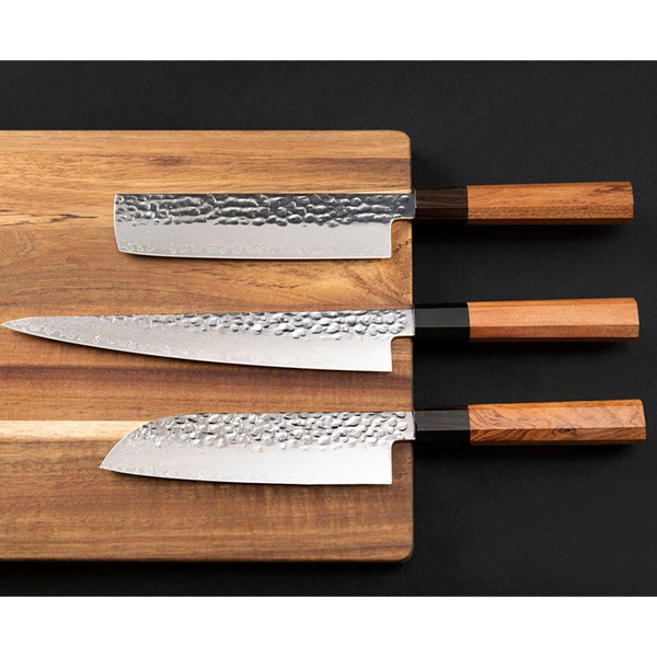 Острието на този нож е изработено по технологията на дамаската стомана, при която десетки слоеве стомана – в случая шестдесет и седем – се наслояват и коват заедно. Тази техника създава структура, в която твърдостта и здравината вървят ръка за ръка с гъвкавостта и устойчивостта на износване. С твърдост от около 58–60 HRC по скалата на Рокуел, острието запазва своята изключителна острота дори при продължителна употреба. Вълнообразният рисунък по повърхността не е декоративно нанесен, а е естествен резултат от наслагването на слоевете, което прави всяко острие уникално и неподражаемо. Допълнителна особеност е характерната „начукана“ или „кована“ повърхност (hammered finish), при която по острието се оформят малки вдлъбнатини. Те придават автентичен ръчен вид, но имат и практична функция – намаляват триенето и предотвратяват залепването на продуктите при рязане, особено на сочни зеленчуци и плодове.