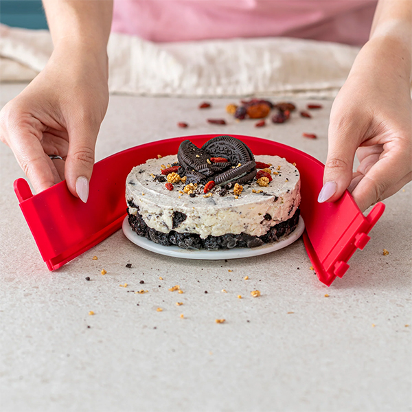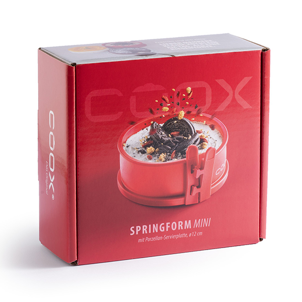 Всеки, който винаги е искал да има торта само за себе си, може да си я направи: мини формата COOX с порцеланова чиния за сервиране се предлага с Ø 12 см! В тази симпатична форма за печене можете да изпечете всеки от любимите си десерти. След изпичане отворете силиконовия ринг и лесно го извадете от порцелановата основа. След това можете да разрежете и сервирате сладкиша директно върху порцелановата чиния.
