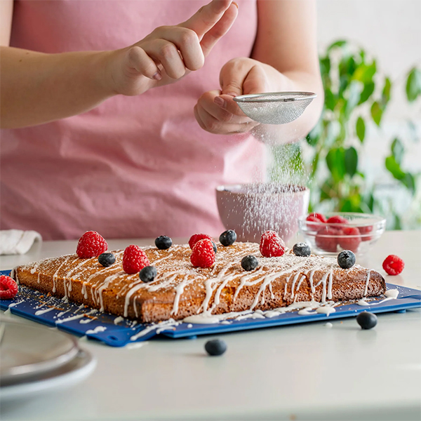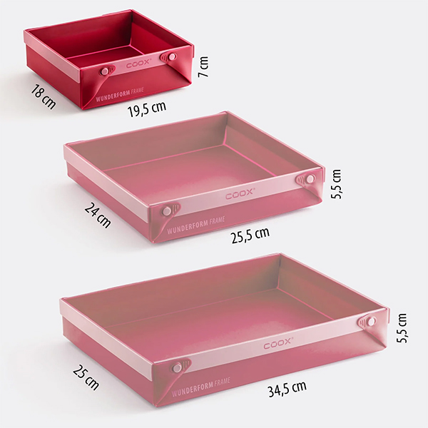 Патентованата WUNDERFORM Frame MQ променя Вашите навици за печене и готвене. Акцентът на квадратния, сгъваем съд за фурна: просто го разгъвате в ъглите и можете веднага да сервирате ястия, печива, сладкиши и други деликатеси! Ръбовете и дъното са подсилени с метал. Това гарантира максимална стабилност и добро боравене при готвене. Не е необходимо да използвате мазнина в силиконовата форма, защото нищо не залепва по нея благодарение на незалепващата повърхност. С обем от 3 литра, размерът MQ е перфектен за солени ястия и може да замени всяка тава във Вашия шкаф. Но също така е идеален за сладолед, сладкиши, хляб, печено и др.