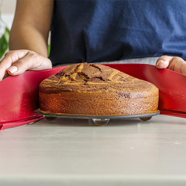 Формата за торта със стъклена основа прави печенето лесно и забавно като детска игра. Просто откопчайте силиконовия пръстен след изпичане, а след това директно сервирайте със стъклената основа. Благодарение на крачета под основата вземането и сервирането е лесно. Силиконовият пръстен има незалепваща функция, няма нужда от намасляване, а почистването е лесно. Сложете в съдомиялната или измийте на ръка.