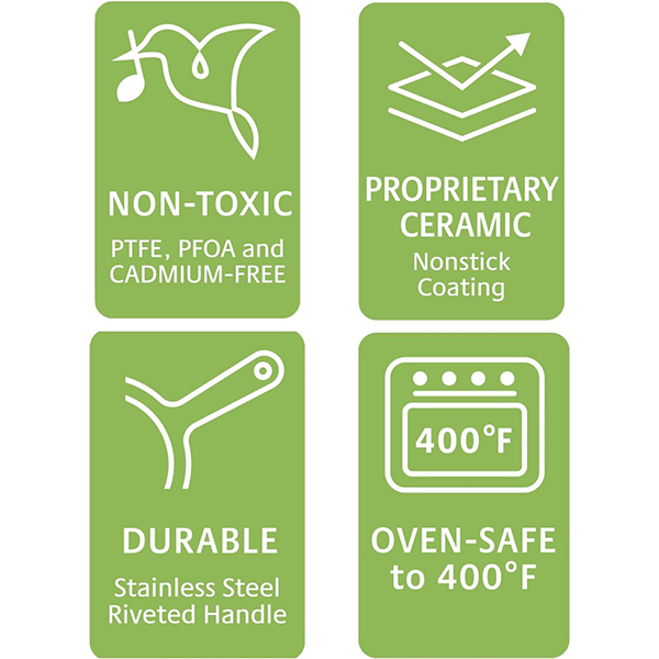 - Не съдържа PTFE, PFOA, олово и тежки метали
