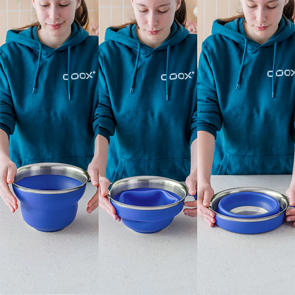 Сгъваемата купа за смесване от Coox е истинска икономия на място! Можете да я сгънете за секунди и да я приберете във всяко чекмедже. Комбинацията от метал и силикон осигурява оптимална стабилност, което прави сгъваемата купа многофункционална: за разбиване, салати, приготвяне на тесто или кремове. Черешката на тортата е ергономичната дръжка. Тя улеснява боравенето с купата и Ви позволява да наливате дори тежки течности без никакви проблеми.