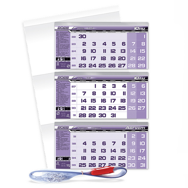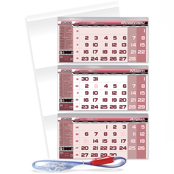 Окомплектовка - три календарни тетрадки, картонена подложка, червено указателно прозорче за дата