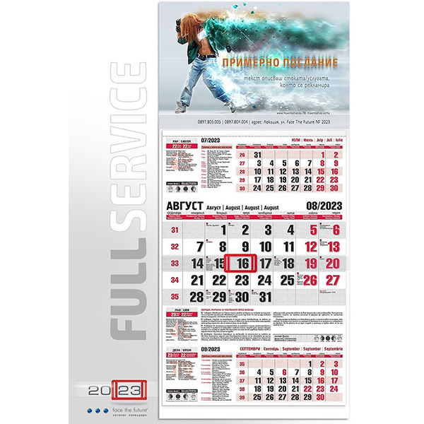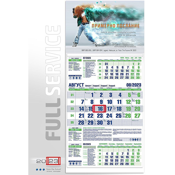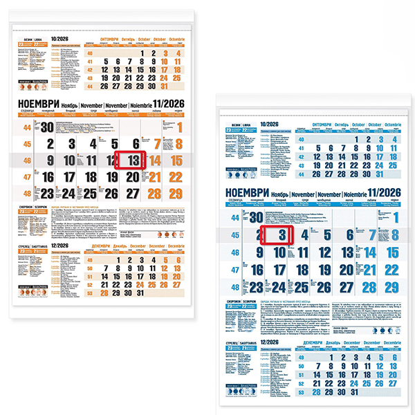 - Работен календар с голяма тетрадка, съдържащ богата информационна авторска част и висок контраст на датите