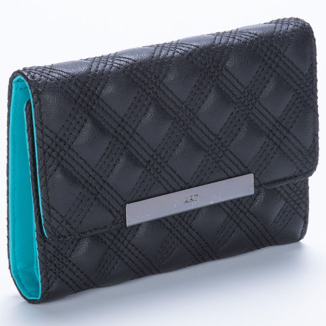 Дамски порфейл с декоративни шевове на ромбове, с капак с метална лайсна, с оранжева вътрешност.