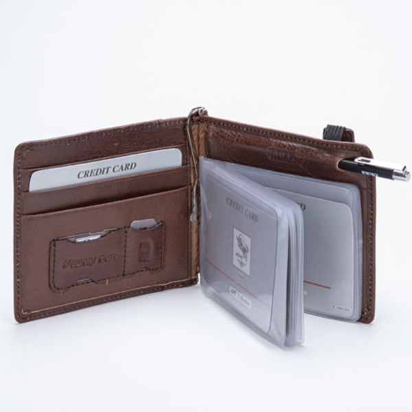 Кожен визитник с щипка за пари, химикалка и ластик.