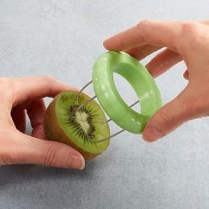 Използвайте първо ножа като разделите плода на две половини. Поставете разпределителя и натиснете леко така, че стоманената тел да нареже на четири равни части. Накрая завъртете и освободете плода от обвивката.
