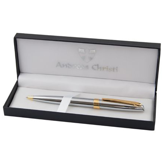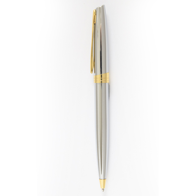 • Елегантна метална химикалка със сребърно хромирано покритие и златисти елементи.