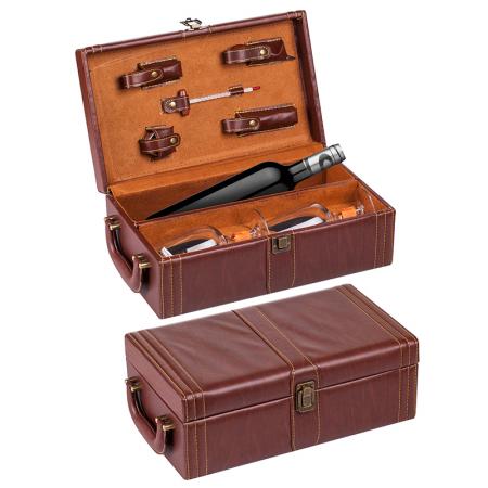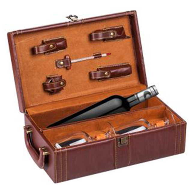 - Луксозен комплект за вино с отделения за бутилка и две чаши. Допълнителните аксесоари включват: