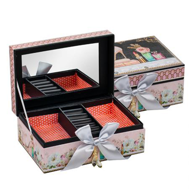 • Кутия за бижута с отделение за пръстени, огледало и панделка