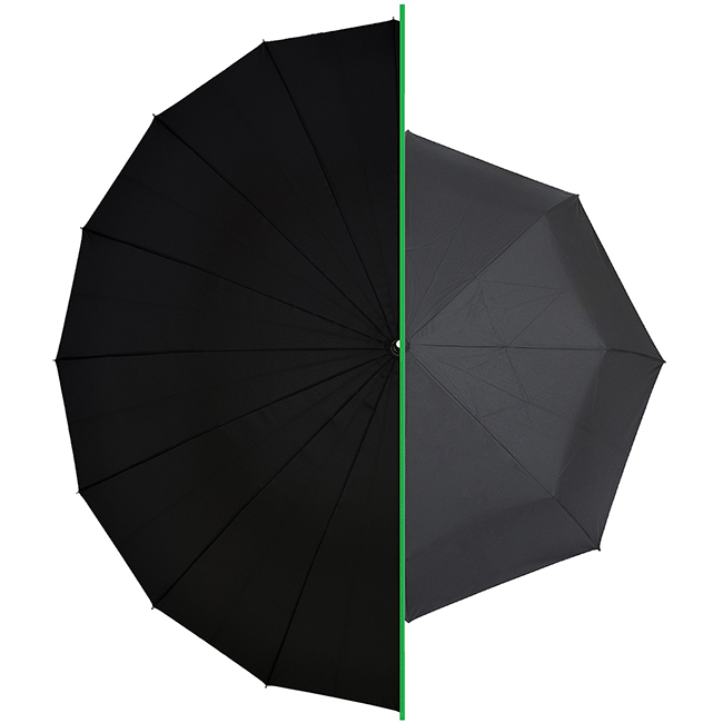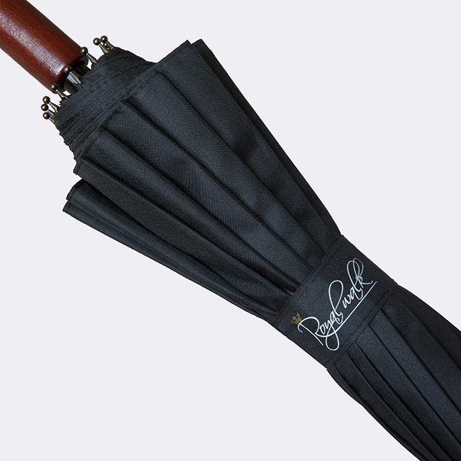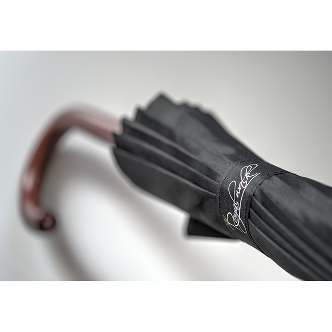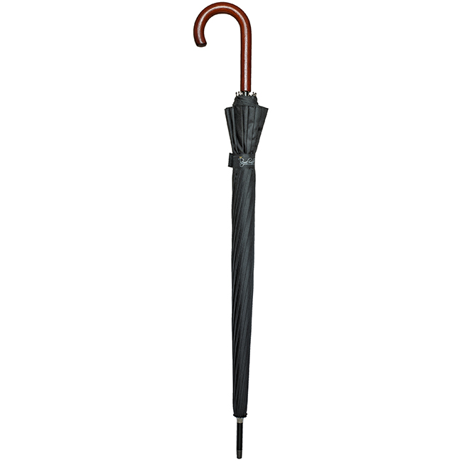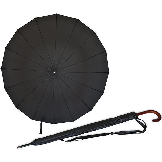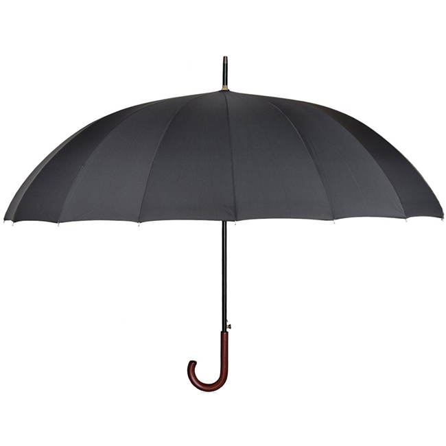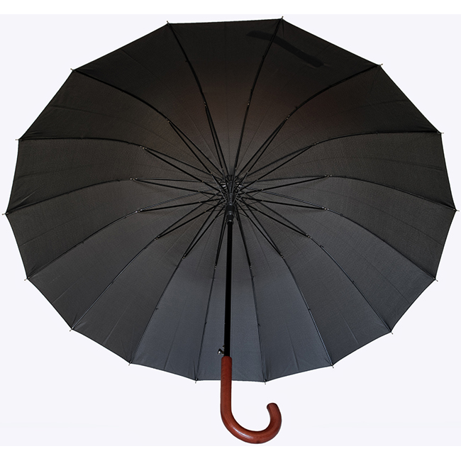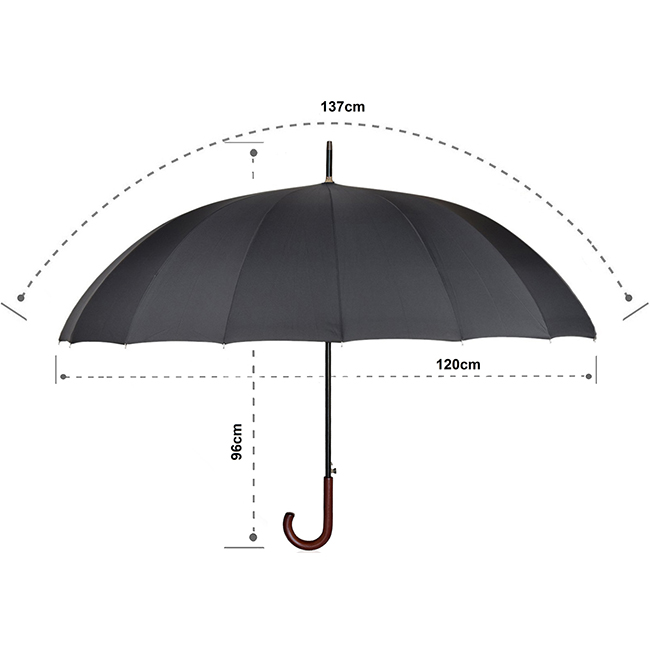Последно поколение тефлонов плат 210Т с Dupont Teflon, 16 ребра и извита, дървена дръжка, голям диаметър, високо качество на изработка и материали, класически черен цвят. Автоматично отваряне. Калъф с презрамка за носене през рамо. Подходящо допълнение към Вашия елегантен стил. Дизайнът е произведен в Англия.