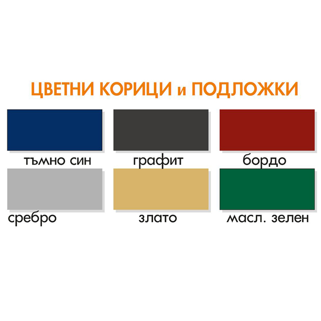 - Цветни корици и подложки - тъмно син, сребро, маслено зелен, жордо, златен, графит
