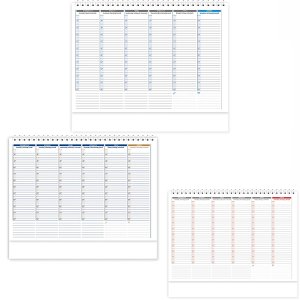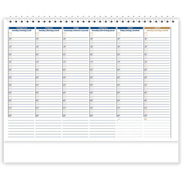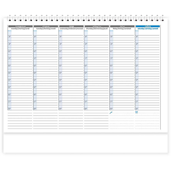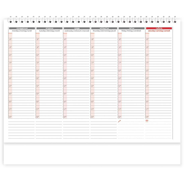- Удобно разделяне на листа на 6 колони, по една за активната работна седмица (вкл. събота) с часови график